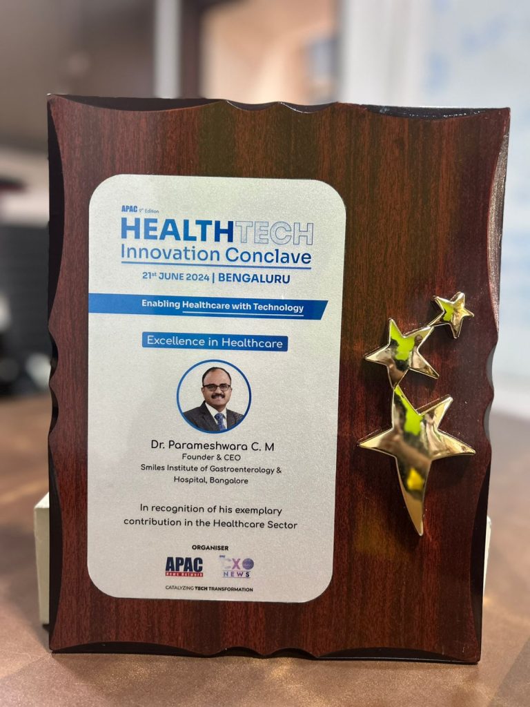 The APAC HealthTech Innovative Conclave proudly presented the Excellence in Healthcare Award to Dr. Parameshwara C M, CEO and Founder of Smiles Gastroenterology, in recognition of his outstanding contributions to the field of gastrointestinal and colorectal care. This prestigious honor celebrates Dr. Parameshwara’s visionary leadership, clinical innovation, and dedication to transforming healthcare delivery in India. Through his pioneering work and commitment to patient-centered care, he has positioned Smiles Gastroenterology as a leading institution in digestive health, setting new benchmarks in advanced treatment and technology-driven solutions.